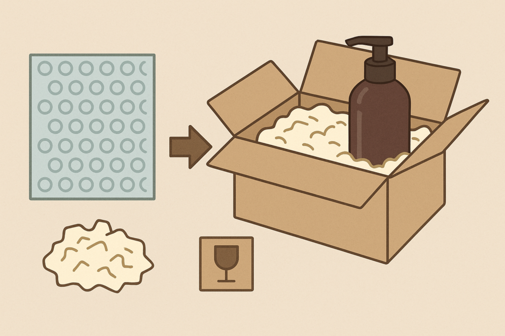 - 新聞紙や緩衝材を詰めて、商品が動かないように